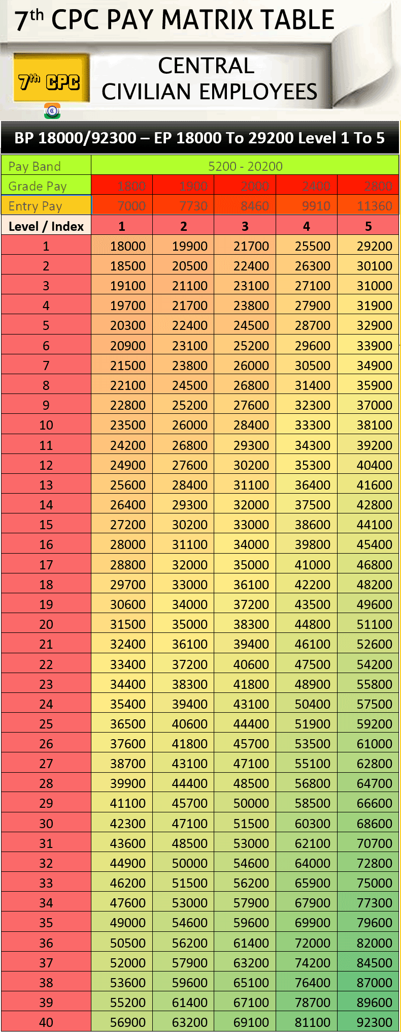 7th Pay Commission Pay Matrix Table Level 1 to 5