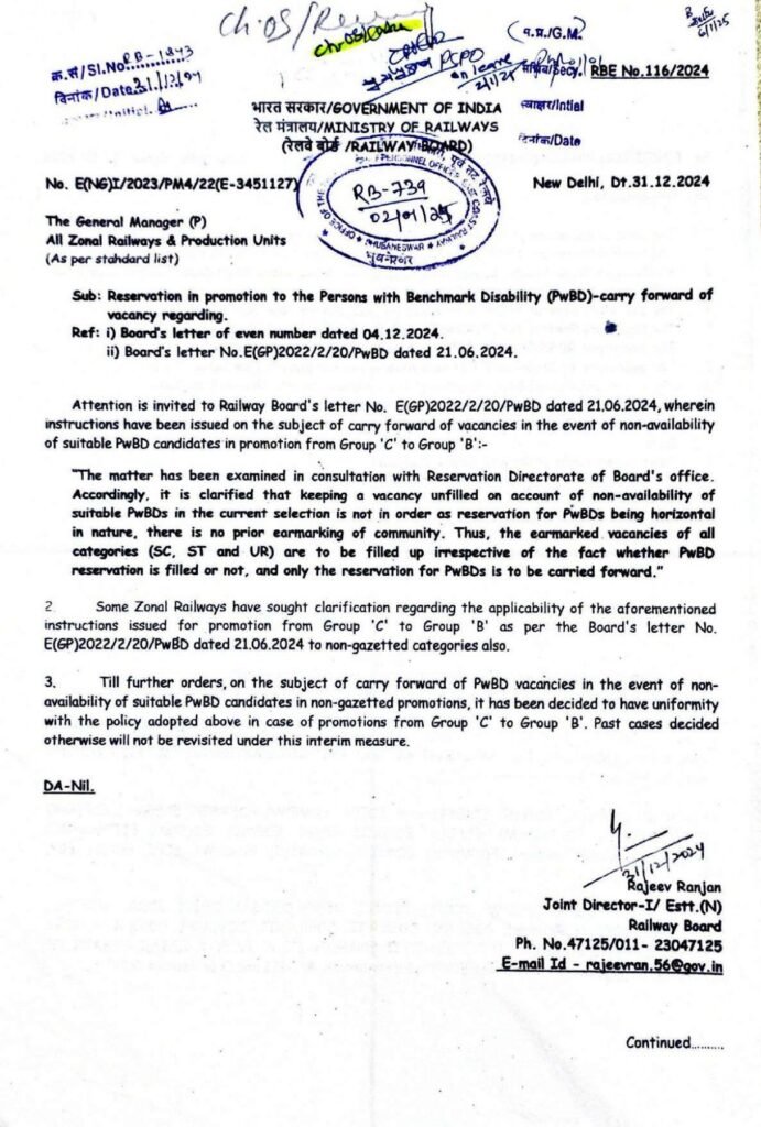 Reservation in promotion to the Persons with Benchmark Disability (PwBD) – Clarification on carry forward of vacancy regarding: Railway Board RBE No. 116/2024 dated 31.12.2024